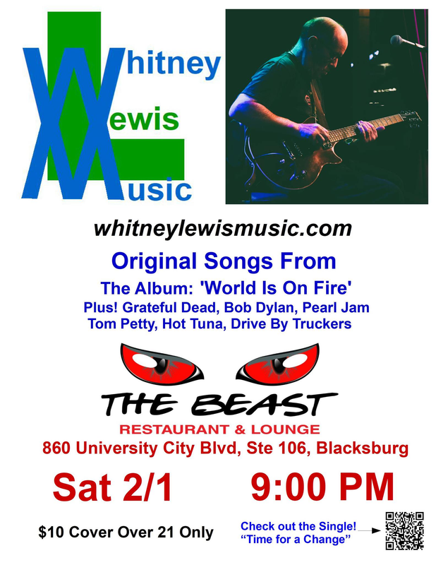 Enjoy original songs from Whitney Lewis' album "World Is On Fire" plus the Grateful Dead, Bob Dylan, Pearl Jam, Tom Petty, Hot Tuna, Drive By Truckers and more in a full band show.