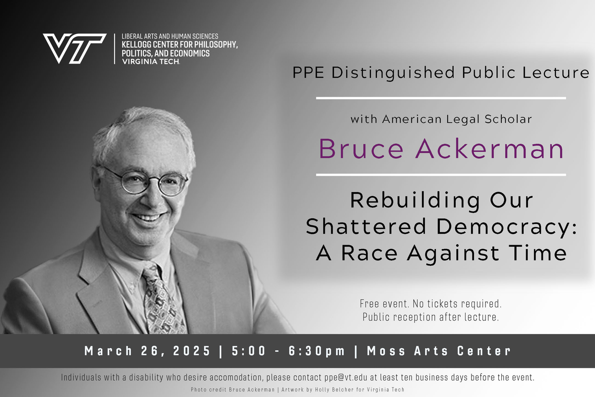 The Kellogg Center for Philosophy, Politics, and Economics at Virginia Tech presents the PPE Distinguished Public Lecture with American Legal Scholar Bruce Ackerman on Wednesday, March 26, 2025 at the Moss Arts Center at Virginia Tech.