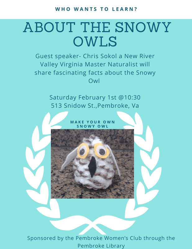 The Pembroke Women's Club invites everyone to learn more about the Snowy Owl! New River Valley Chapter of Virginia Master Naturalists member Chris Sokol will share fascinating facts about the Snowy Owl at this program.