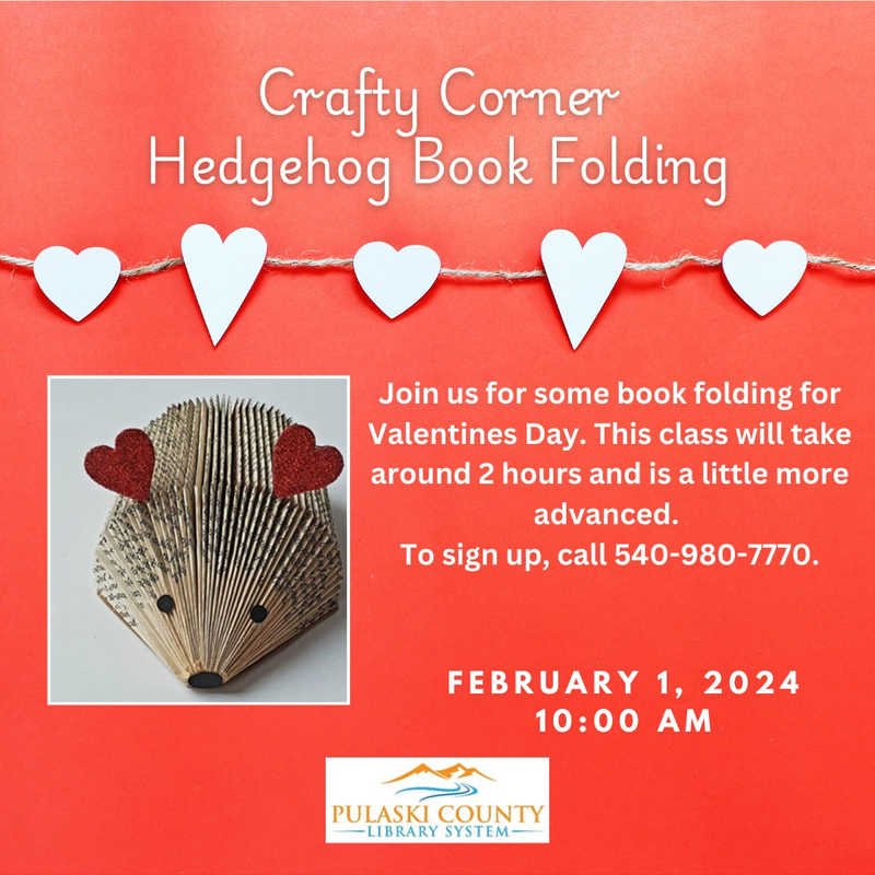 The Pulaski County Library continues the monthly The Crafty Corner series in February with the theme "Hedgehog Book Folding" on Saturday, February 1, 2025.