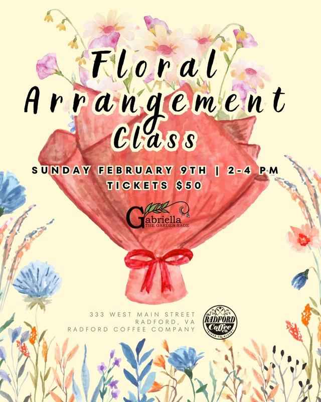 Radford Coffee Company presents a Flower Arrangement Class with Gabriella the Garden Sage on Sunday, February 9, 2025.