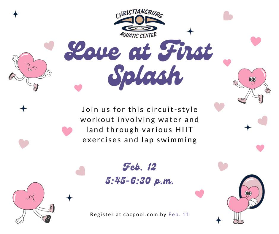 The Christiansburg Aquatic Center presents Love at First Splash for Ages 16 & Up on Wednesday, February 12, 2025.