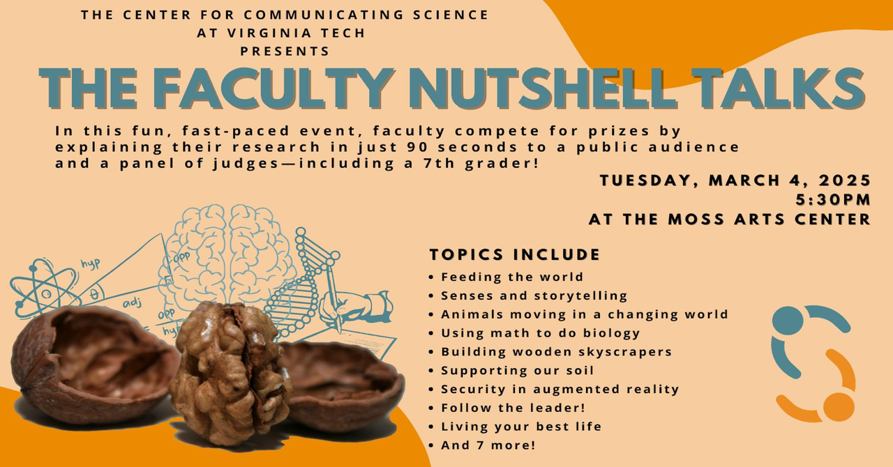 The Center for Communicating Science at Virginia Tech and other Virginia Tech presents The Faculty Nutshell Talks on Tuesday, March 4, 2025 at the Moss Arts Center at Virginia Tech.