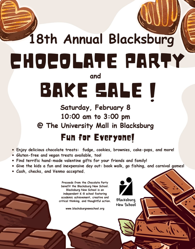 The Blacksburg New School presents their 18th Annual Chocolate Party on Saturday, February 8, 2025 at the University Mall in Blacksburg, VA.