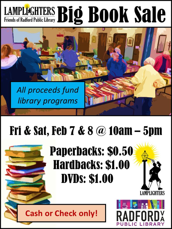 The Radford Public Library hosts the Quarterly Lamplighters Big Book Sale on Friday, February 7, 2025 and Saturday, February 8, 2025 from 10:00 AM to 5:00 PM each day.