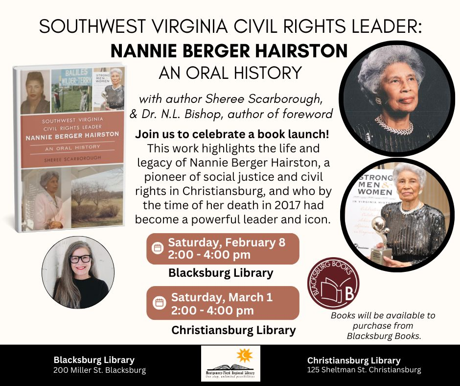 Join us to celebrate the release of "Southwest Virginia Civil Rights Leader: Nannie Berger Hairston - An Oral History". Author Sheree Scarborough and Dr. N.L. Bishop (author of the book's foreword) will discuss the life of Nannie Berger Hairston, a trailblazer in social justice and civil rights. From her family’s move to Christiansburg in 1953 to her legacy as an icon and leader by the time of her death in 2017, Nannie’s journey is one of resilience, courage, and activism.