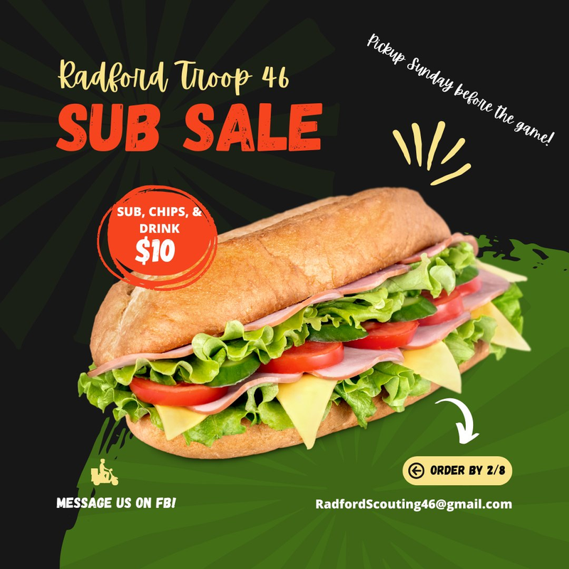 Scouts Troop 46 presents their Sub Sandwich Sale on Sunday, February 9, 2025 at The Presbyterian Church of Radford with an order deadline of Saturday, February 8, 2025 by 4:00 PM.