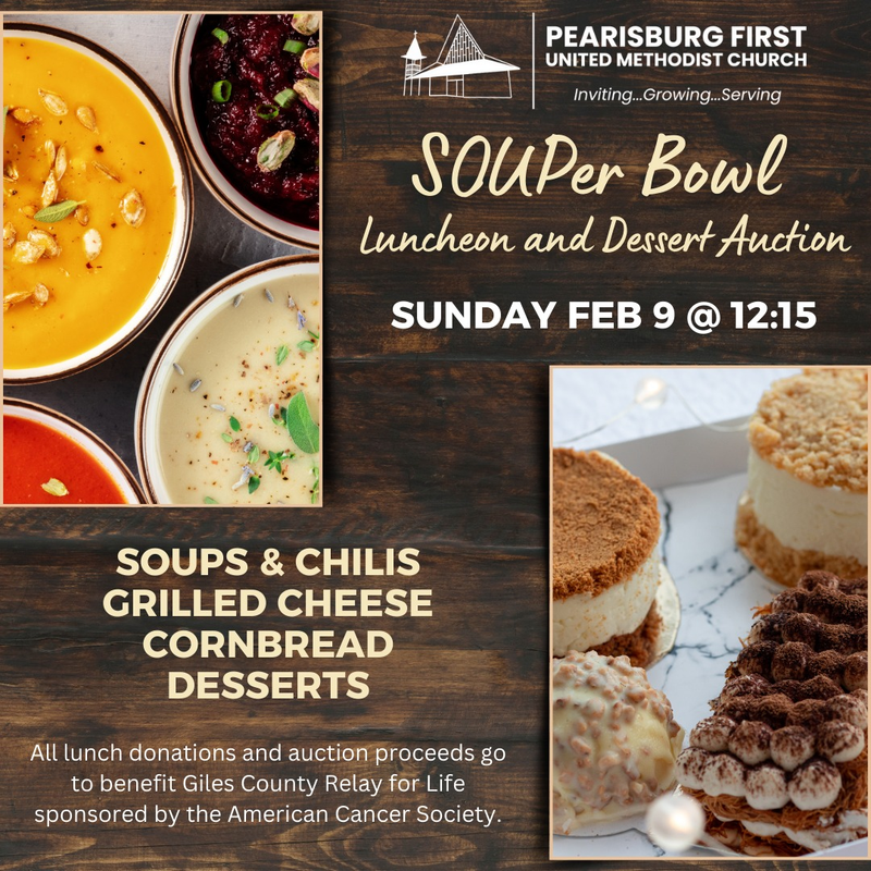 Pearisburg First United Methodist Church presents their Souper Bowl Luncheon and Dessert Auction on Sunday, February 9, 2025.