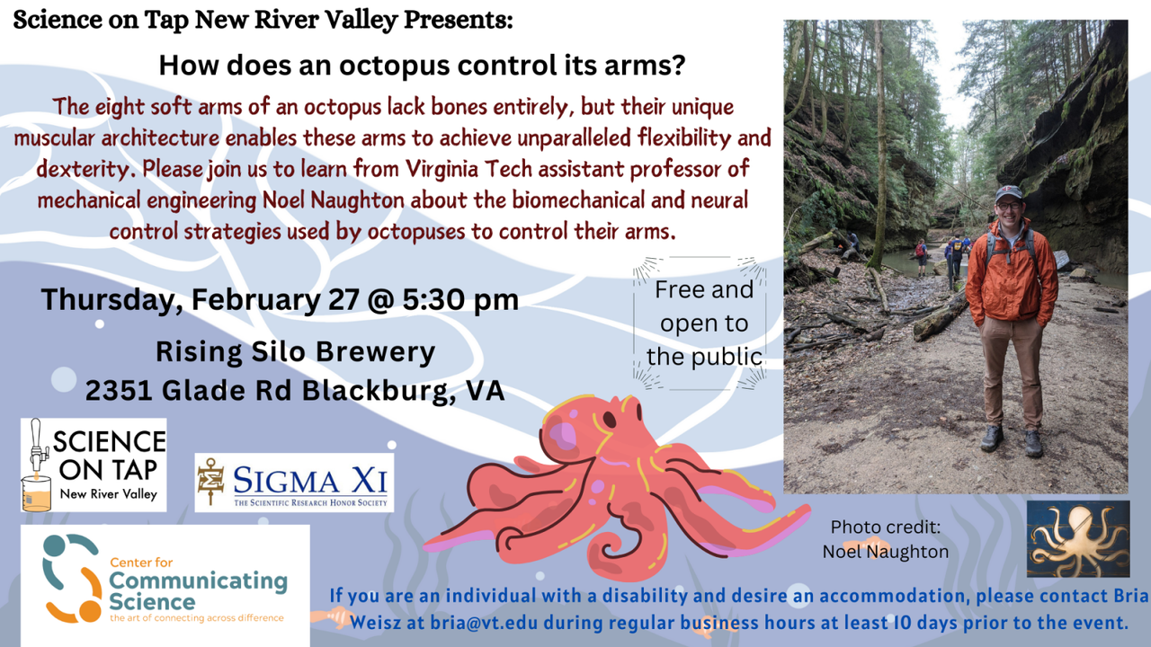 Science on Tap - New River Valley presents their February program titled "How does an octopus control its arms?" on Thursday, February 27, 2025 at Rising Silo Farm Brewery.