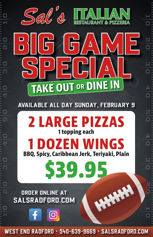 Sal's Italian Restaurant And Pizza presents their Big Game Special on Sunday, February 9, 2025.