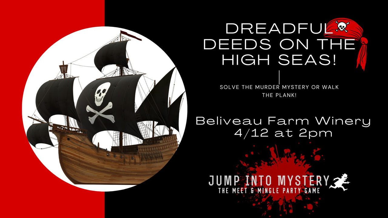 Jump Into Mystery presents Interactive Murder Mystery titled "Dreadful Deeds on the High Seas" on Saturday, April 12, 2025 at Beliveau Farm Winery.