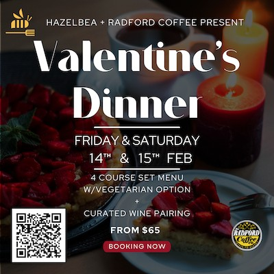 Radford Coffee Company and HazelBea Catering presents their Four Course Set Menu Valentine's Dinner on Friday, February 14, 2025 and Saturday, February 15, 2025.