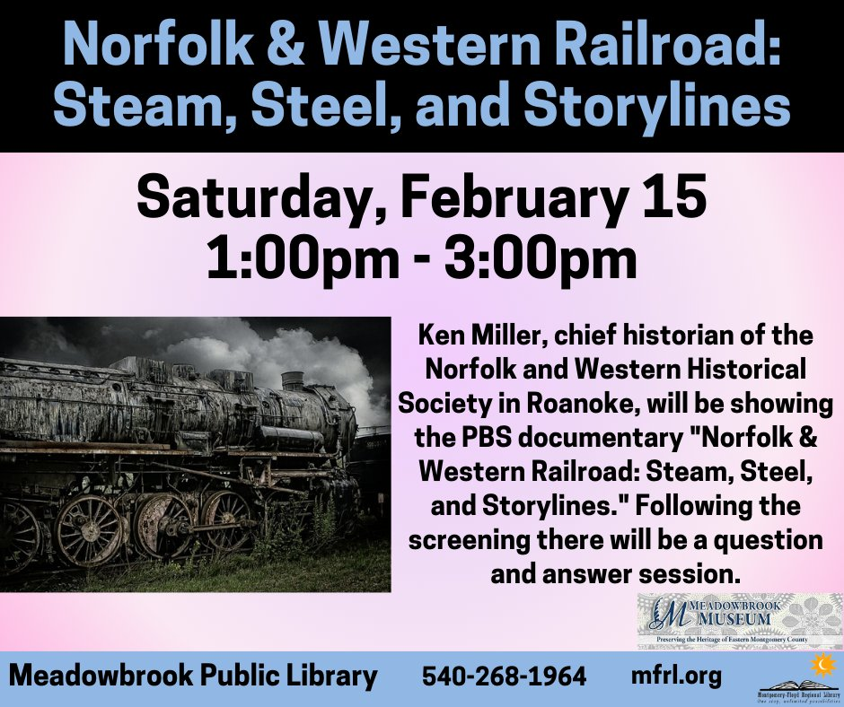Ken Miller, chief historian of the Norfolk and Western Historical Society in Roanoke, will be showing the PBS documentary "Norfolk & Western Railroad: Steam, Steel, and Storylines". Following the screening there will be a question and answer session.