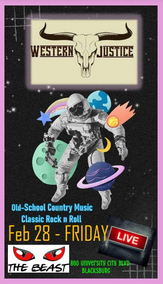 The Beast of Blacksburg Pizzeria & Bar presents Western Justice in concert on Friday, February 28, 2025.