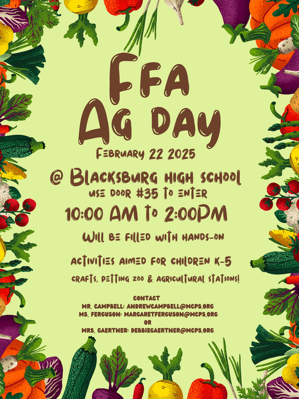 Blacksburg High School's FFA Chapter presents their Annual Agriculture Community Day on Saturday, February 22, 2025 from 10:00 AM to 2:00 PM.