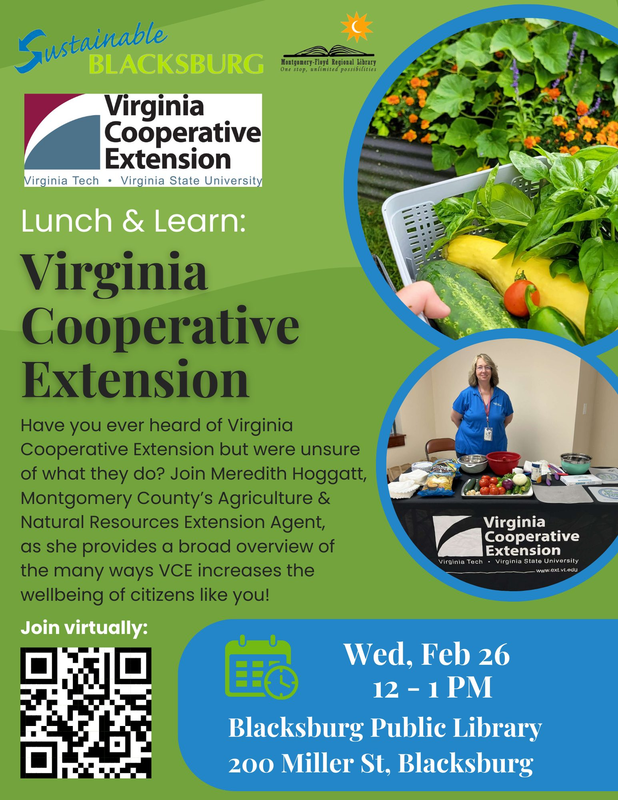 Sustainable Blacksburg continues their Lunch and Learn series with Virginia Cooperative Extension on Wednesday, February 26, 2025 at the Blacksburg Library in person and online on Zoom.