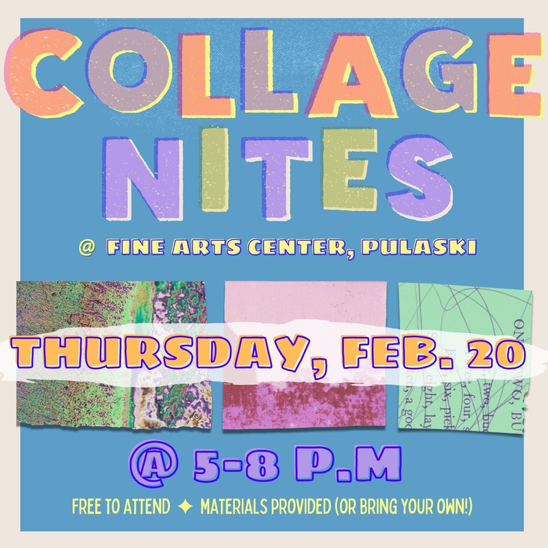 The Fine Arts Center for the New River Valley presents Collage Nites on Thursday, February 20, 2025.