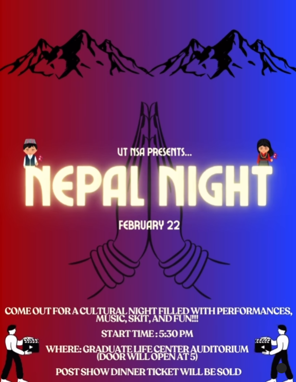 Enjoy a cultural night filled with performances, music, skits, fashion and fun illuminating the rich Nepali culture! Nepal Night is an annual event in which members of Nepalese Student Association showcase the diversity and culture of Nepal.