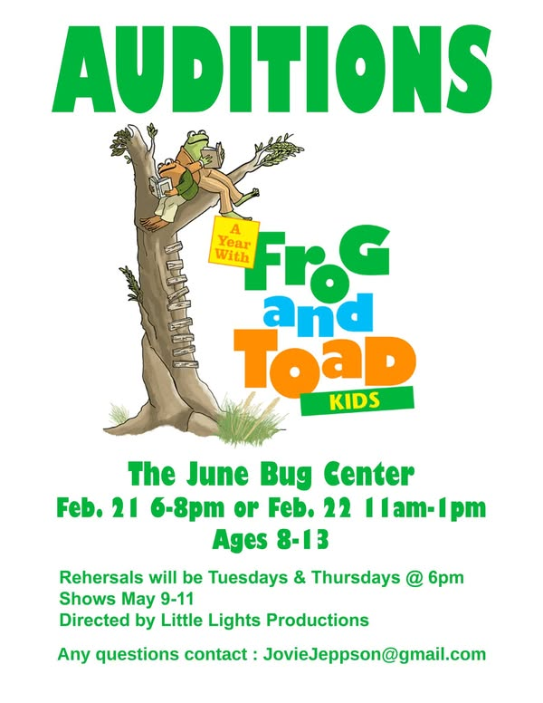 The June Bug Center holds Auditions for "A Year with Frog and Toad Kids" on Friday, February 21, 2025 and on Saturday, February 22, 2025.