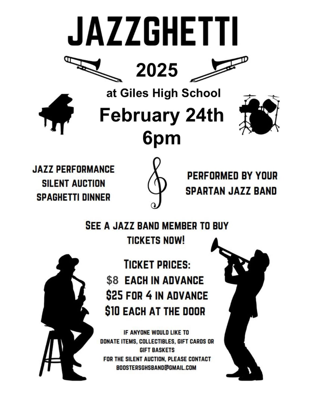 Giles High School Spartan Bands presents Jazzghetti 2025 on Monday, February 24, 2025 at Giles High School.