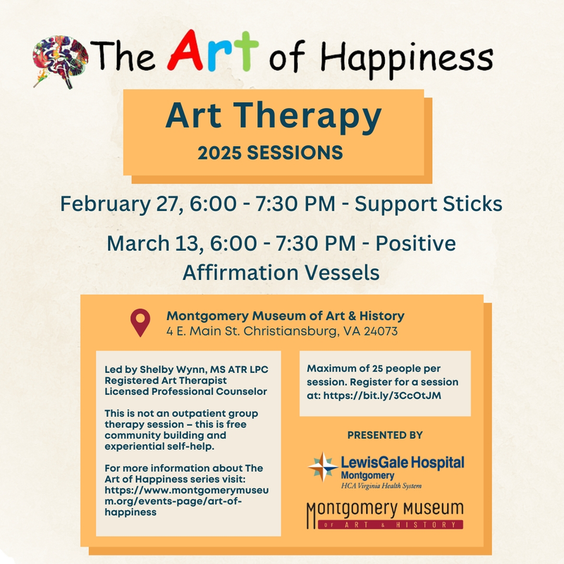 The Montgomery Museum of Art and History is also pleased to announce a 2025 series of art therapy sessions that will offer self-help coping tactics and strategies by using art exhibits, materials, and spaces as helpful tools to address mental health issues. This interactive series entitled, “The Art of Happiness,” will focus on aspects of positive psychology and the role that art can play in general happiness and well-being. Now in its third year, this program series will be held at the Montgomery Museum once a month through February - March, from 6:00 p.m. to 7:30 PM.