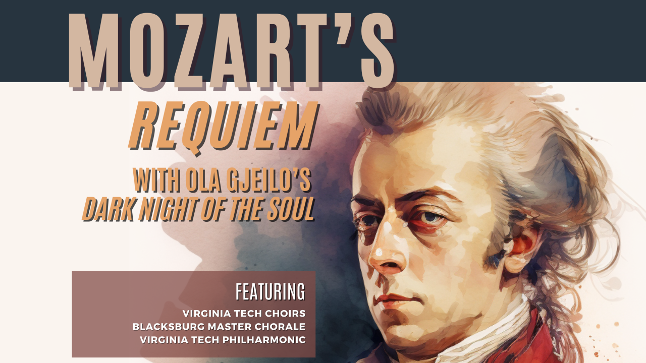 The Virginia Tech Choirs, Virginia Tech Philharmonic Orchestra, and the Blacksburg Master Chorale come together to present one of the most well-known and glorious works for choir and orchestra, Wolfgang Amadeus Mozart's "Requiem," along with a performance of Ola Gjielo's "Dark Night of the Soul."