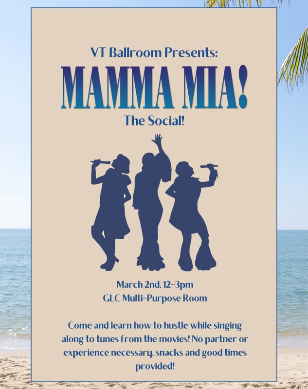 Join Virginia Tech's Ballroom Club at our Mamma Mia-themed dance social. Learn how to hustle while singing along to tunes from the movies!