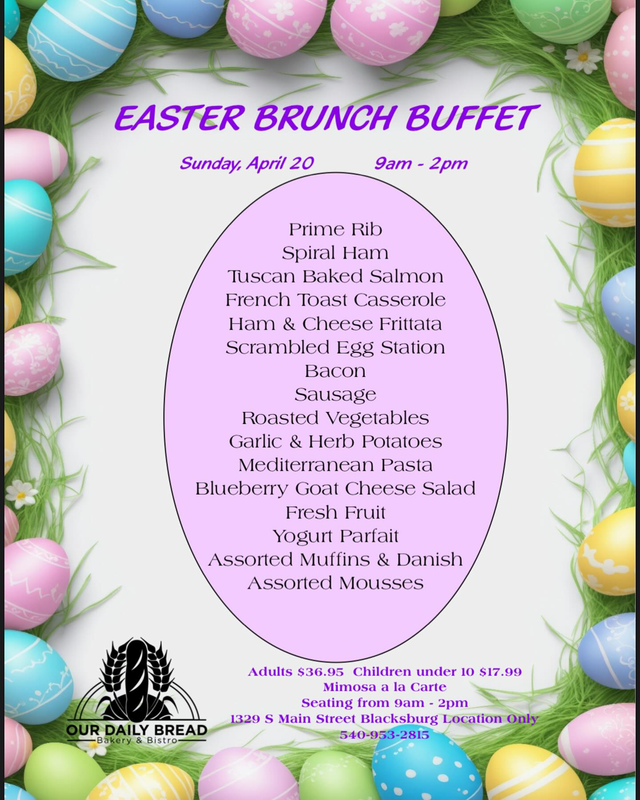 Our Daily Bread Bakery & Bistro presents their 2025 Easter Brunch Buffet on Sunday, April 20, 2025.