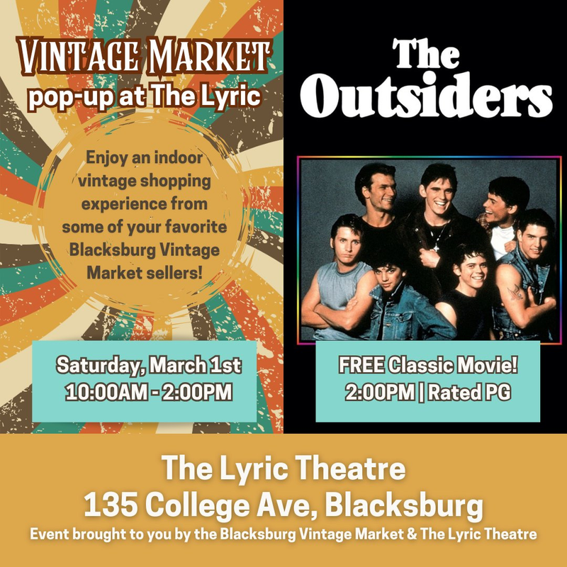 Blacksburg Vintage Market presents a Vintage Market Pop-Up followed by a Free Screening of "The Outsiders" on Saturday, March 1, 2025 at The Lyric Theatre in Blacksburg, VA.