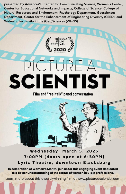 The Center for Communicating Science at Virginia Tech presents a Film & Reel Talk Panel Conversation for "Picture A Scientist" on Wednesday, March 5, 2025 at The Lyric Theatre in Blacksburg, VA.