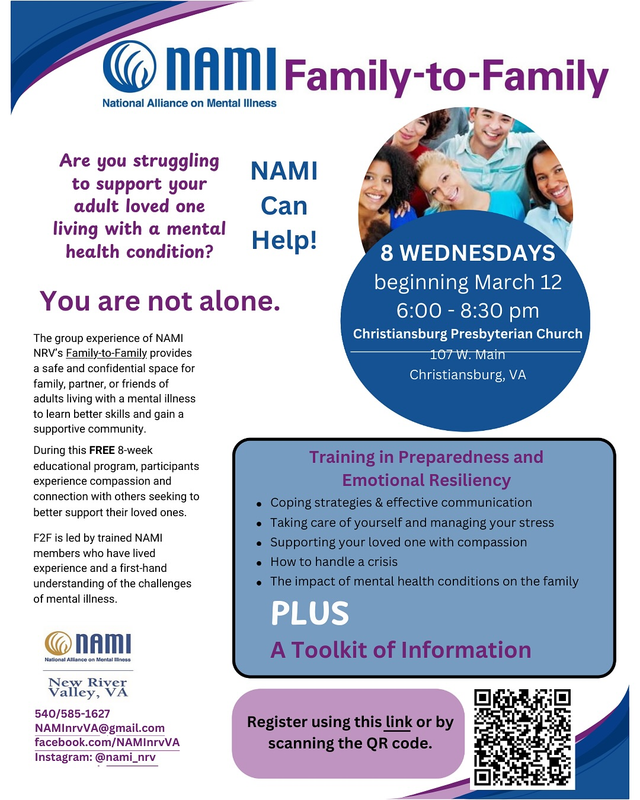 The National Alliance on Mental Illness of the New River Valley (NAMI NRV) presents a Nine Week Family-to-Family Course starting on Wednesday, March 12, 2025 meeting weekly from 6:00-8:30 PM at the Christiansburg Presbyterian Church.