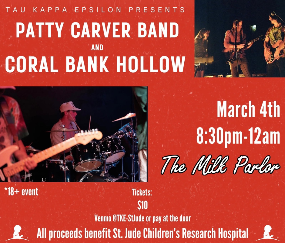Tau Kappa Epsilon presents a St. Jude Children's Research Hospital Fundraising Concert with music by Patty Carver Band and Coral Bank Hollow on Tuesday, March 4, 2025 at The Milk Parlor.