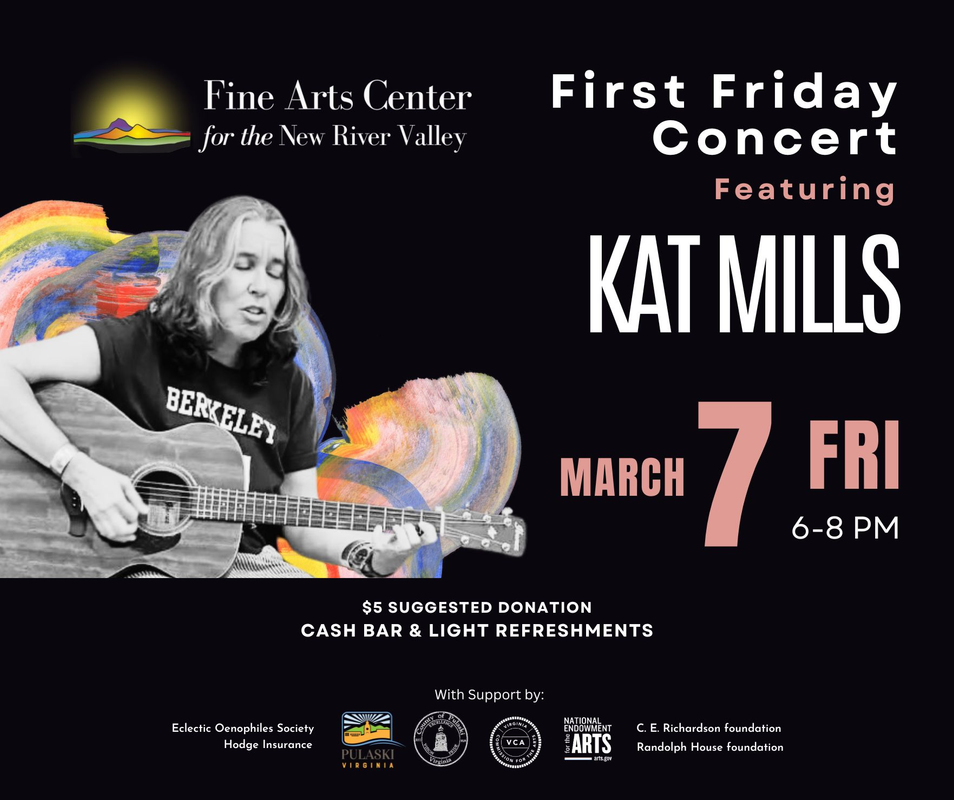 The Fine Arts Center for the New River Valley presents their March First Friday Concert featuring Kat Mills on Friday, March 7, 2025.