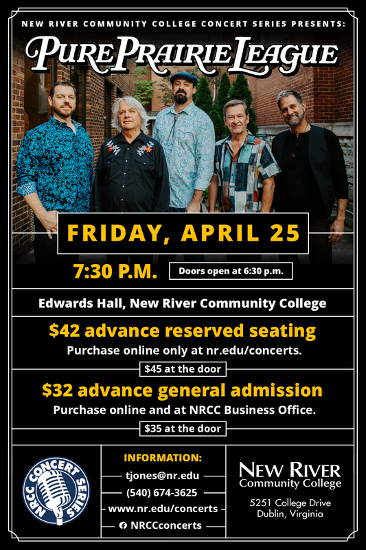 New River Community College's Concert Series presents Pure Prairie League in concert on Friday, April 25, 2025 inside 117 Edwards Hall located on the New River Community College campus in Dublin, VA.