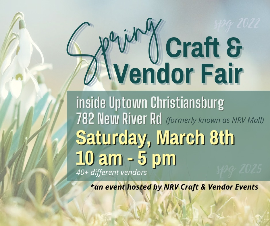 NRV Craft & Vendor Events hosts their 2025 March Craft & Vendor Fair on Saturday, March 8, 2025 at Uptown Christiansburg (formerly New River Valley Mall).