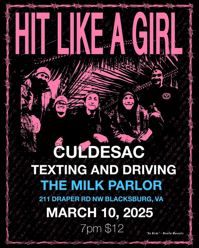 The Milk Parlor presents Three Band Concert with Hit Like A Girl, Culdesac and Texting And Driving on Monday, March 10, 2025.