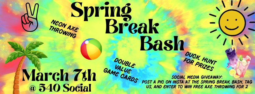 • Social Media Giveaway: Post a pic on Instagram at our Spring Break Bash, tag us, and be entered to win a free Axe Throwing session for two.