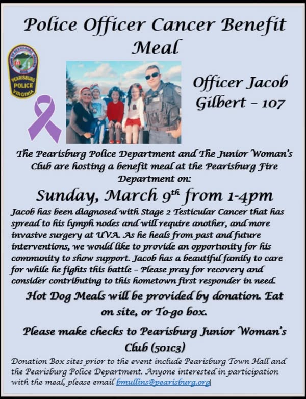 The Pearisburg Police Department and the Pearisburg Junior Woman's Club are hosting a Police Officer Cancer Benefit Meal for Officer Jacob Gilbert on Sunday, March 9, 2025 at the Pearisburg Fire Department.