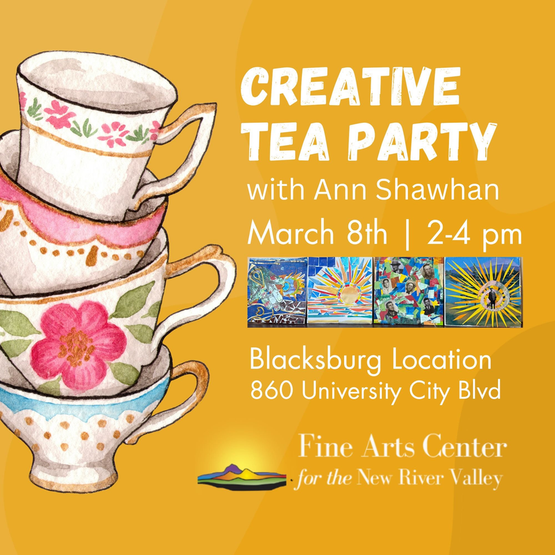 The Fine Arts Center of the New River Valley presents a Creative Tea Party on Saturday, March 22, 2025 at their Blacksburg, VA location.