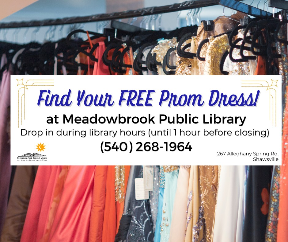 Drop in to browse and choose a free prom dress during regular library hours, ending an hour before closing. Dresses in all sizes and styles are available for students in the New River Valley!
