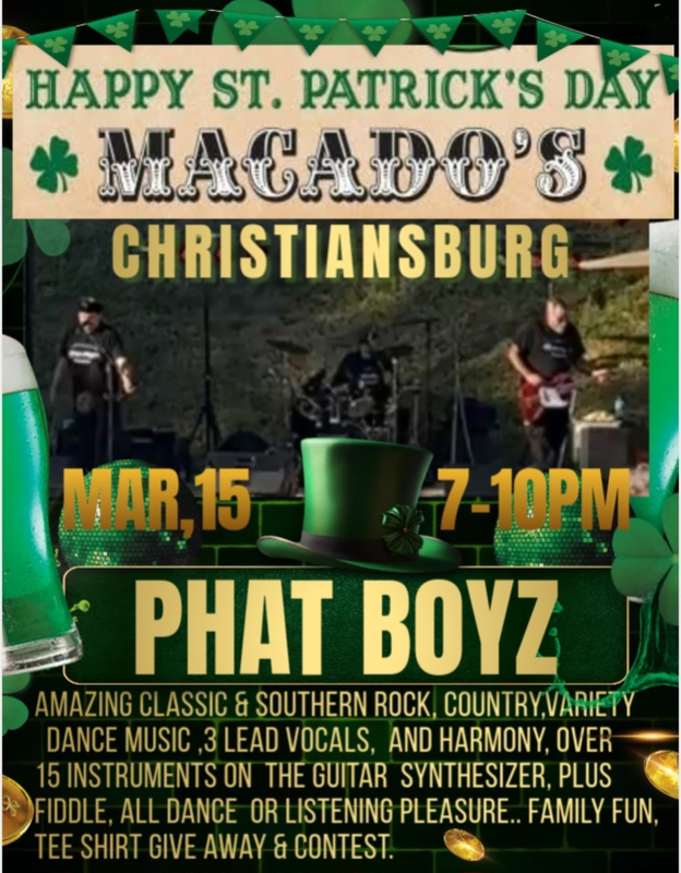 Macado's Christiansburg presents their Annual St. Patrick's Day Party with the Phat Boyz Band on Saturday, March 15, 2025.