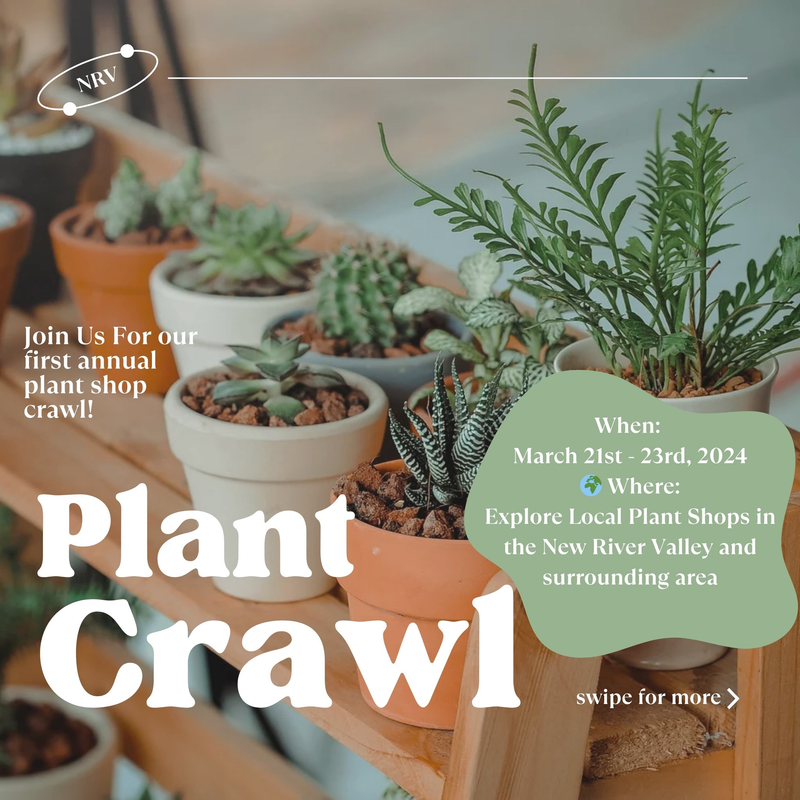Join us for our annual plant shop crawl! A plant crawl is a great way to see all the amazing local plant shops in our area. Explore local plant shops in the New River Valley and surrounding area with several participating locations.