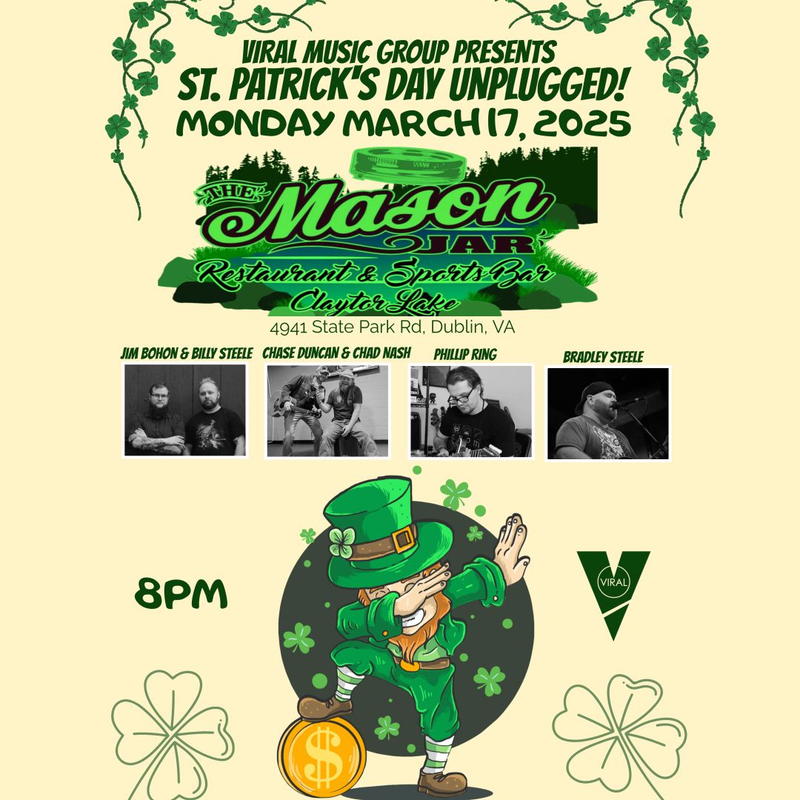 The Mason Jar at Claytor Lake presents St. Patrick's Day Unplugged on Monday, March 17, 2025.
