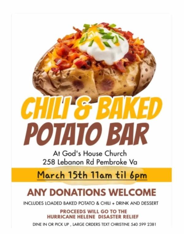 God's House Church in Pembroke, VA presents a Chili & Baked Potato Bar for Hurricane Helene Disaster Relief on Saturday, March 15, 2025.
