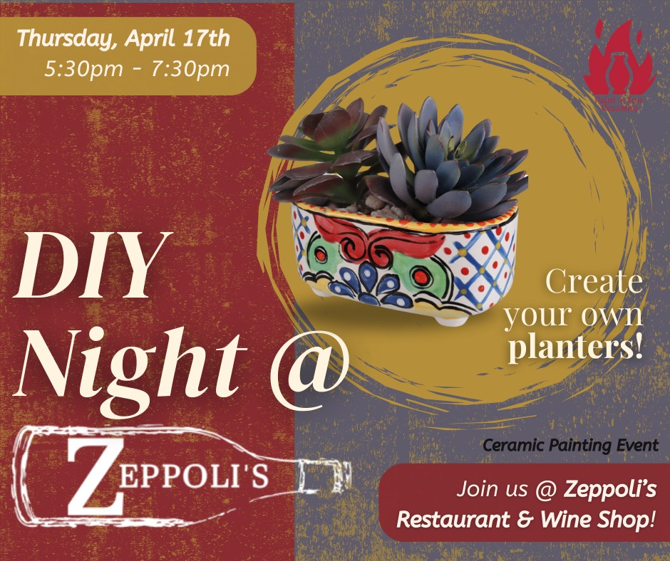 Join us for a delightful evening of creativity and fun in partnership with Paint ‘n Fun Ceramics! This special DIY night offers you the chance to paint your own planter while enjoying the cozy atmosphere and delicious offerings of Zeppoli’s.