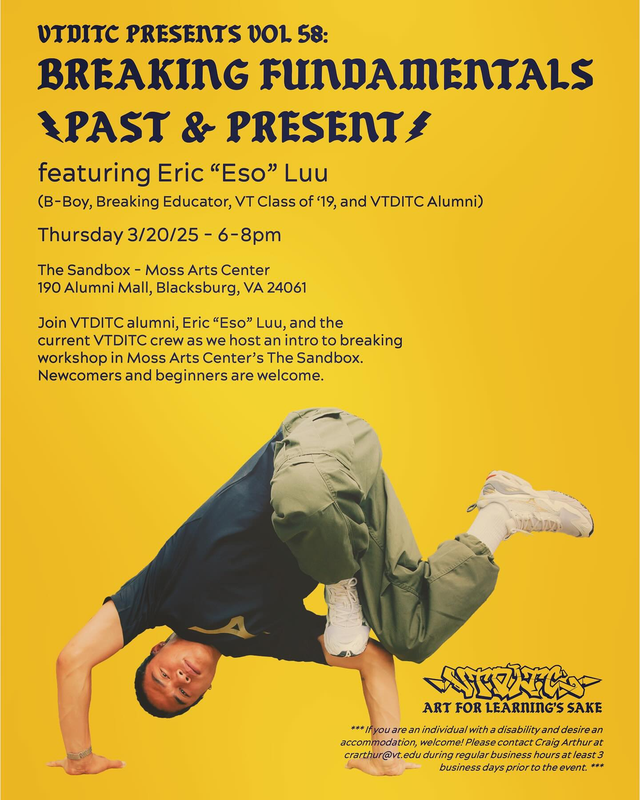 Join #VTDITC alum (VT Class of 2019) and champion bboy Eric "Eso" Luu and the current VTDITC crew as we host an intro to breaking workshop. Eric returns to Blacksburg to share his knowledge of and passion for the dance.