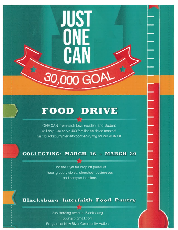 The Blacksburg Interfaith Food Pantry presents Just One Can 30,000 Goal Food Drive starting on Sunday, March 16, 2025 and continuing through Sunday, March 30, 3025.