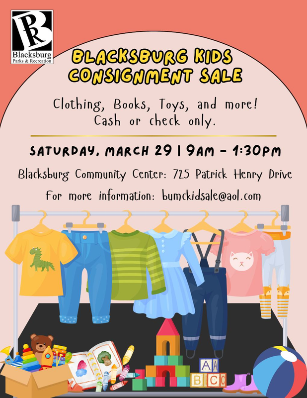 The 2025 Blacksburg Children's Spring Consignment Sales will be hosted by the Town of Blacksburg at the Blacksburg Community Center on Saturday, March 29, 2025.