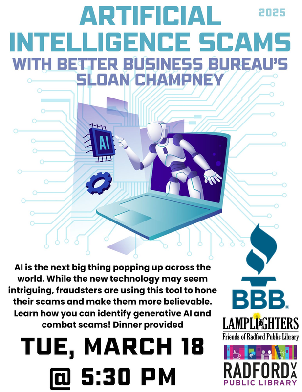 The Radford Public Library presents the program "Artificial Intelligence Scams" with the Better Business Bureau's Sloan Champney on Tuesday, March 18, 2025.