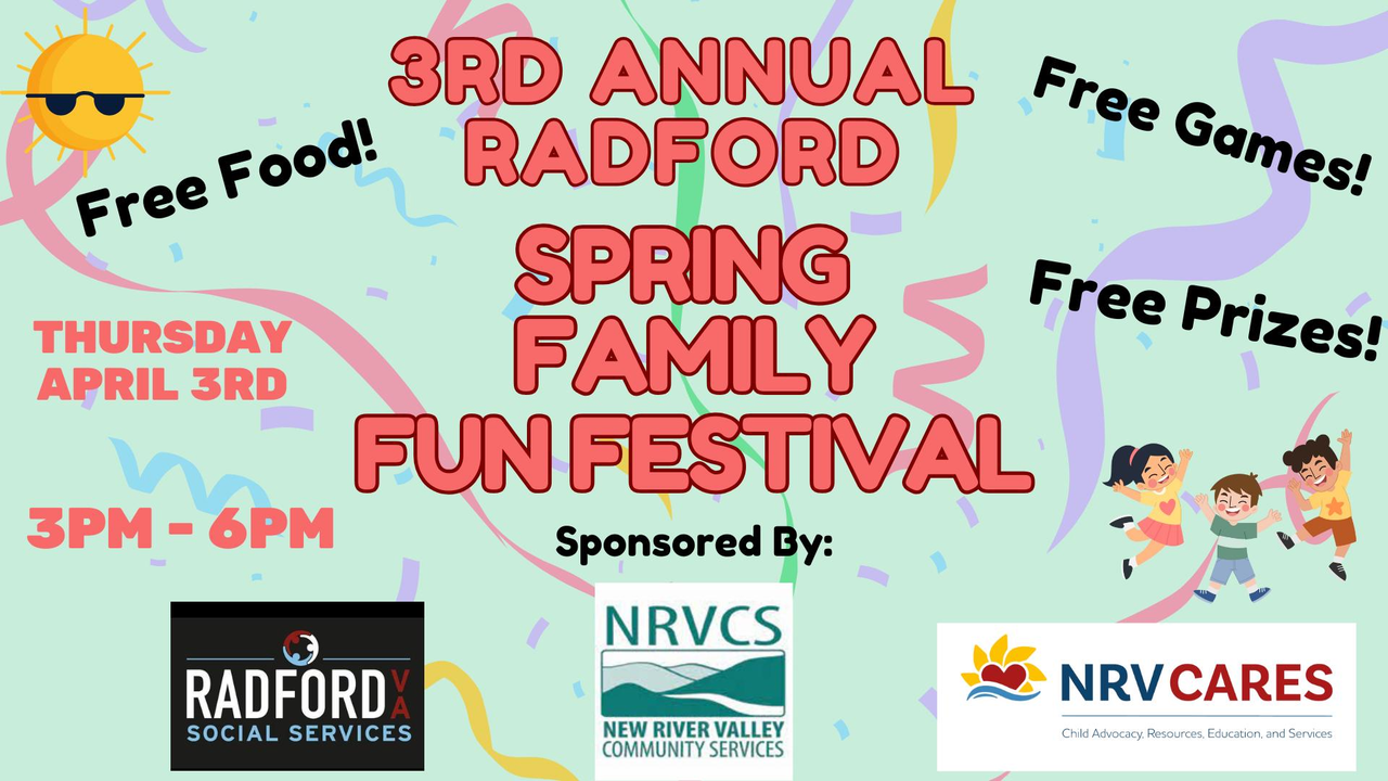 NRV Cares and New River Valley Community Services presents their 3rd Annual Radford Spring Family Fun Festival on Thursday, April 3, 2025.